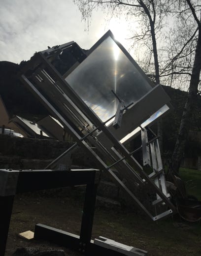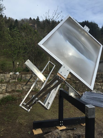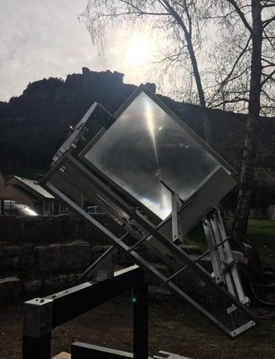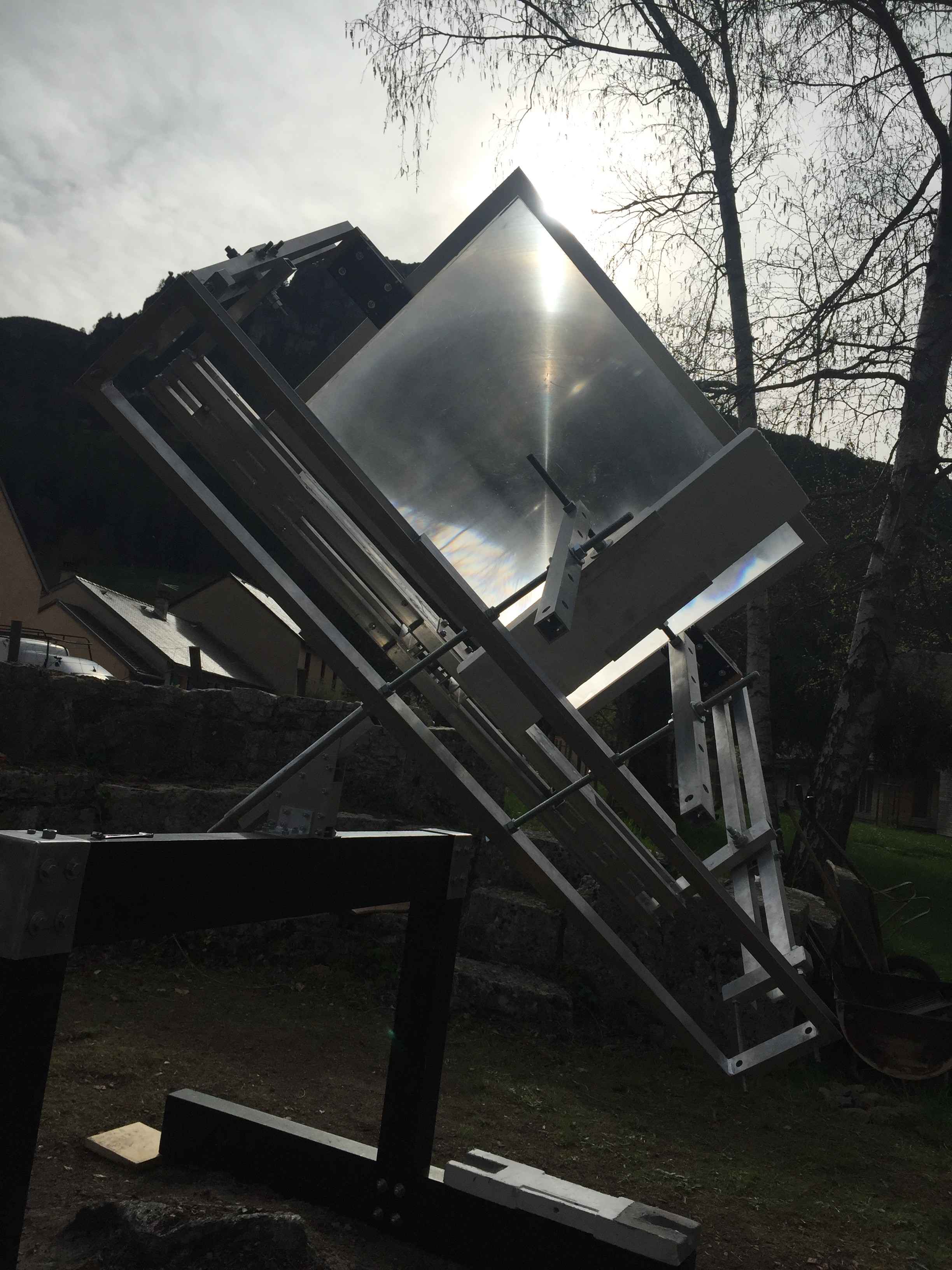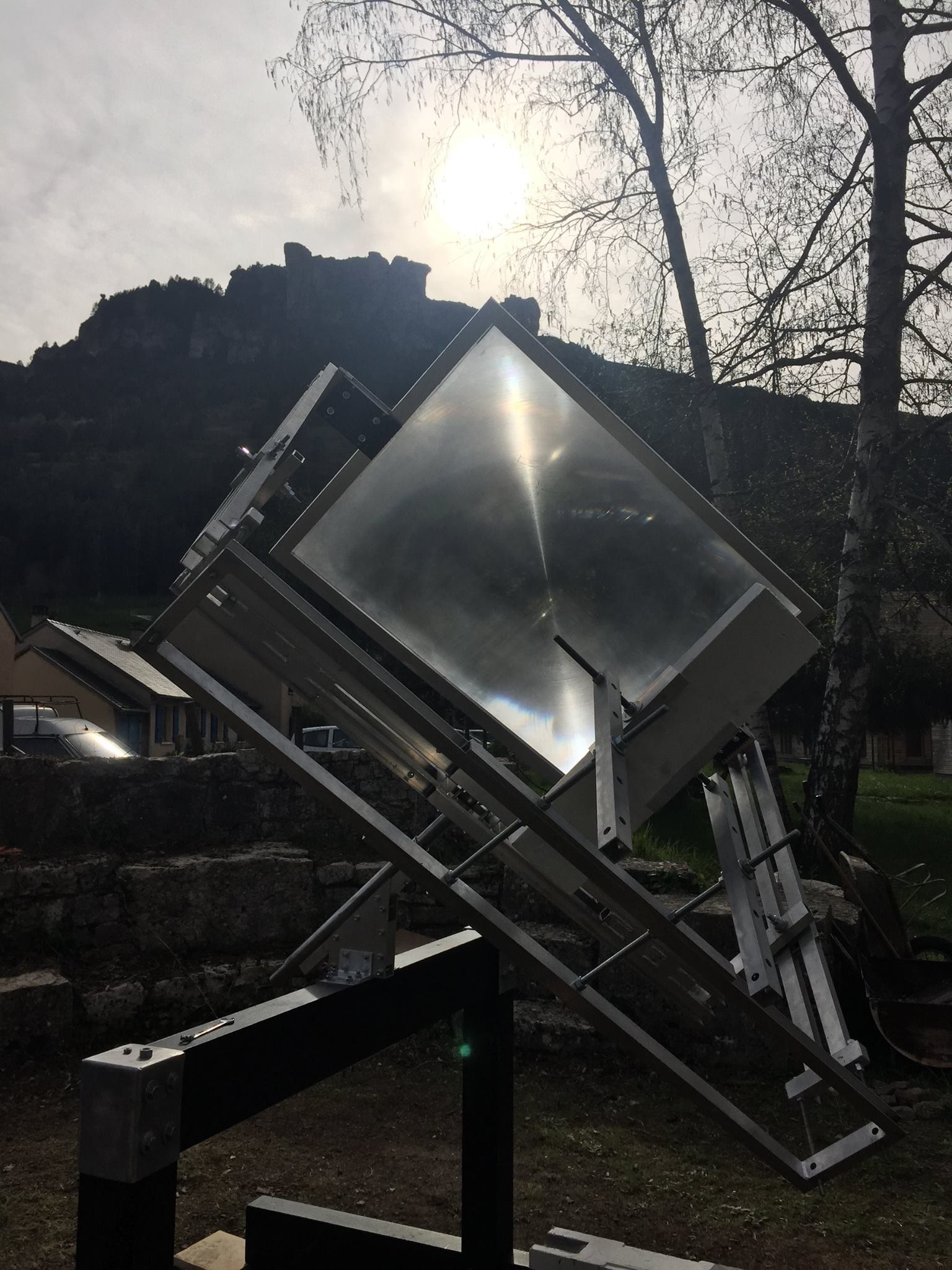 Le concentrateur dans les jardins de l’École Supérieure d’Agronomie de FLorac. L’axe de rotation de la monture est incliné selon la latitude de Florac, soit 44.32 degrés.