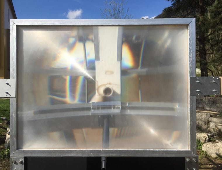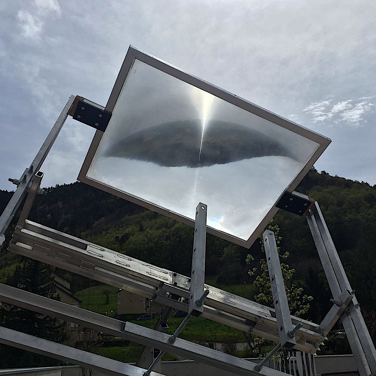 Le concentrateur solaire est fait d’une grande lentille de Fresnel fixée sur une monture astronomique. Il concentre le feu solaire sur un creuset en céramique réfractaire.