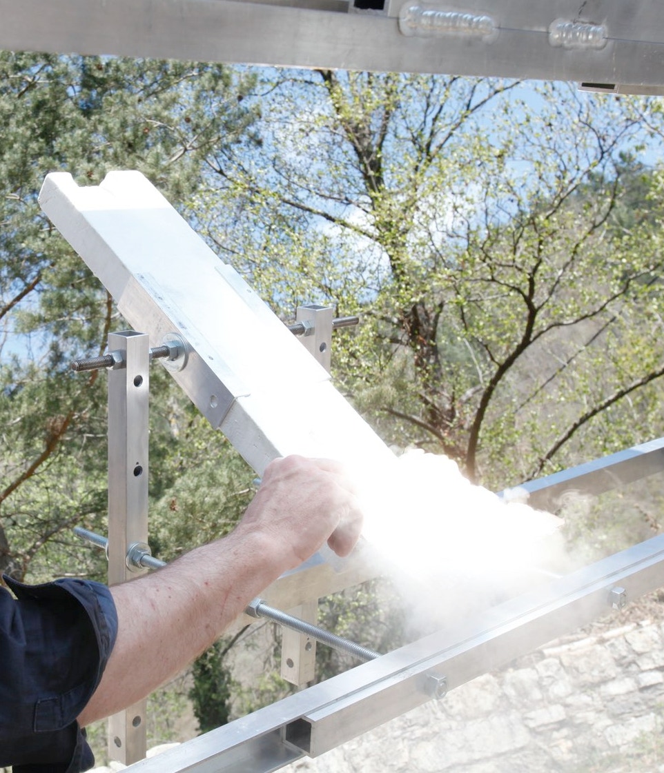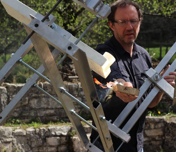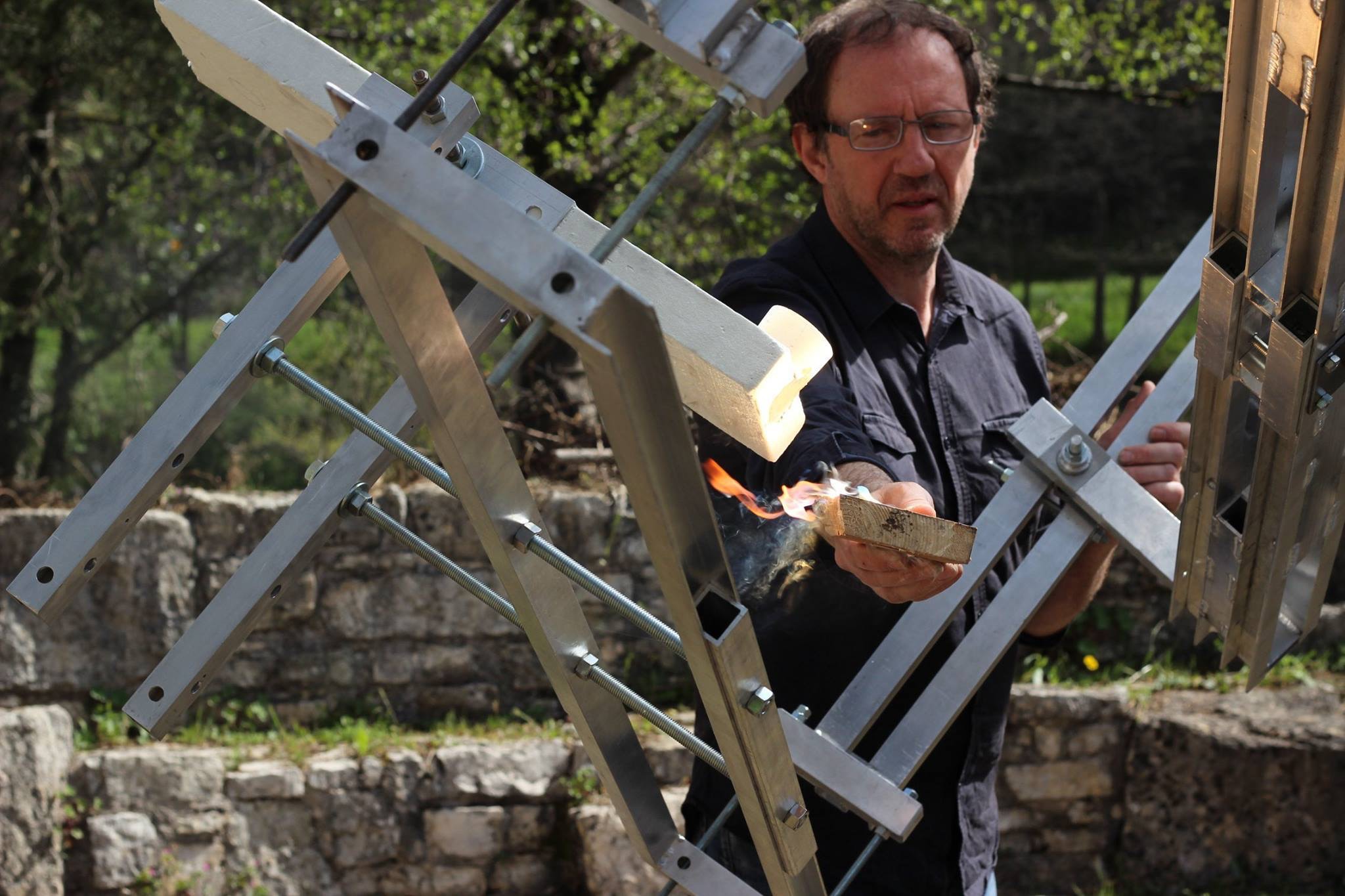 Tests de la monture avant les premiers essais de fusion. Les températures atteintes sont si élevées qu’un madrier de bois s’enflamme quasiment comme une explosion et qu’un bloc de ciment commence instantanément à fondre.