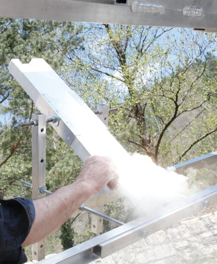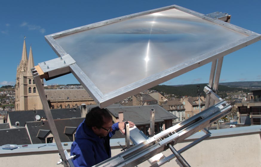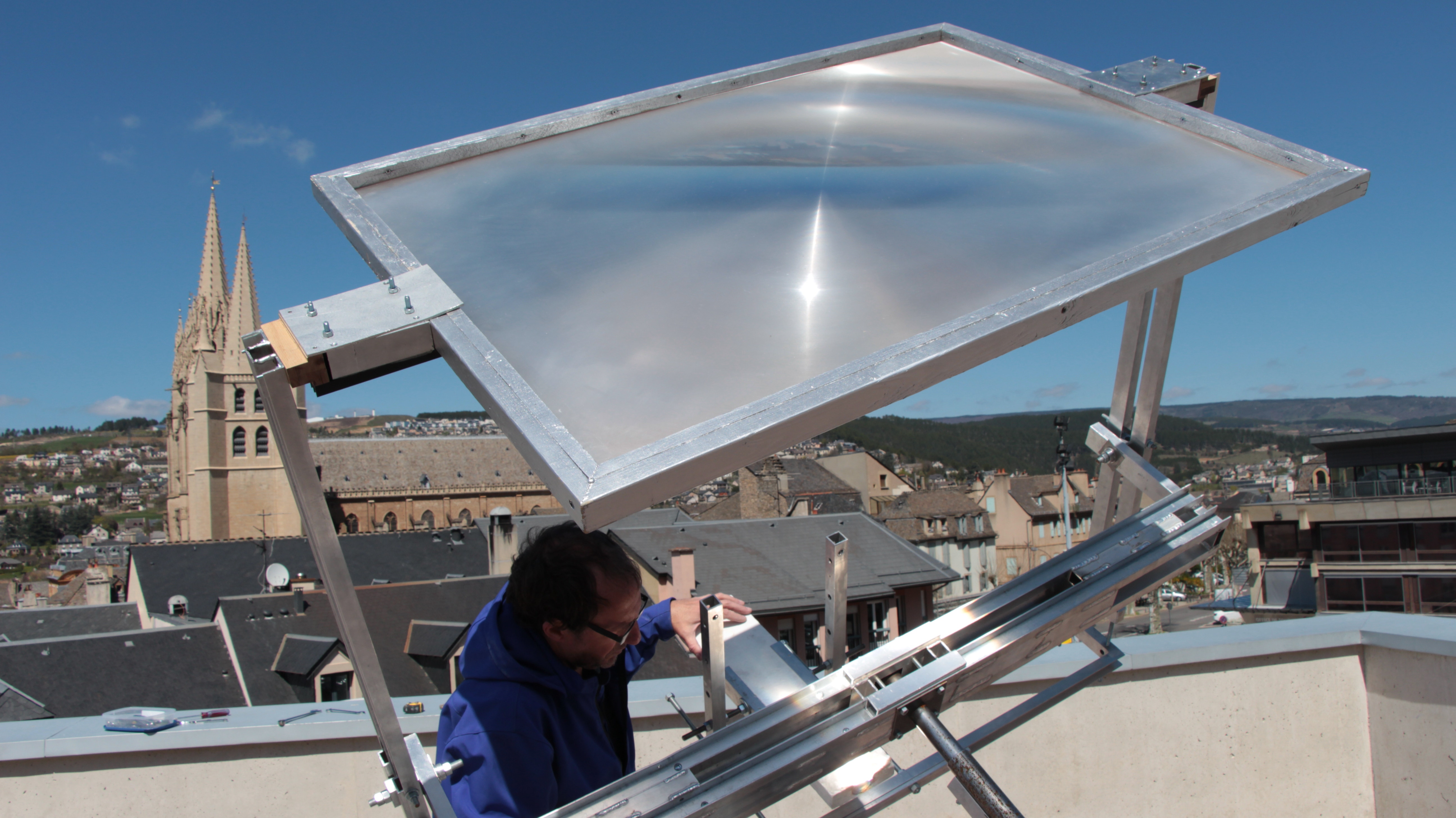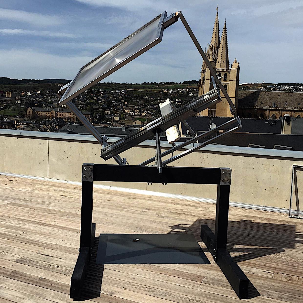 Sur le toit de l’espace Georges-Frêche, à Mende. Une simple rotation de l’ensemble lentille-creuset lui permet de suivre le mouvement diurne du Soleil et de maintenir le point focal sur le creuset.